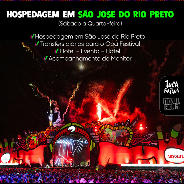 NOSSO PACOTE INCLUI : HOSPEDAGEM EM SÃO JOSÉ DO RIO PRETO TRANSFERS DIÁRIOS PARA O OBA FESTIVAL HOTEL - EVENTO - HOTEL ACOMPANHAMENTO DE MONITOR ATENÇÃO: